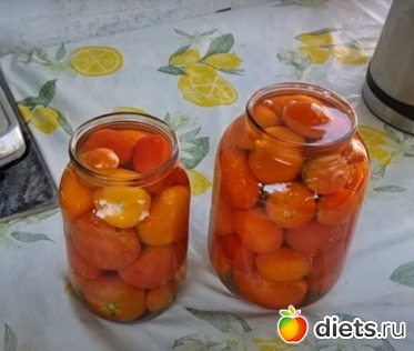 В стерилизованные банки выкладываем плотно помидоры, заливаем их крутым кипятком. Оставляем банки с прикрытыми крышками на 15 минут, а затем выливаем воду.