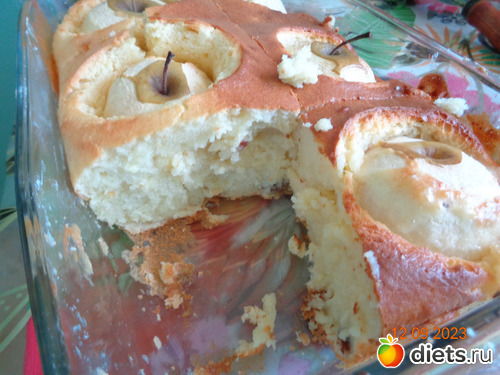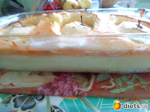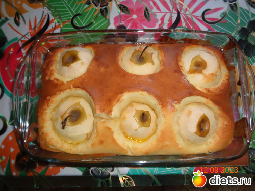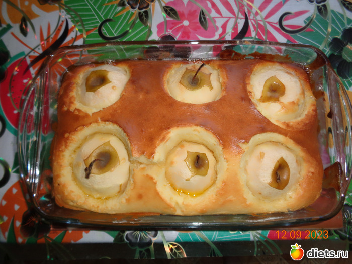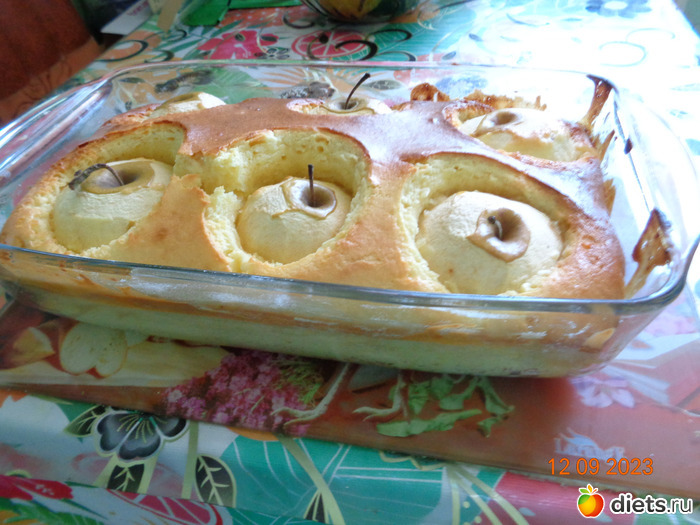 3. Перелить жидкое тесто в форму, каждое яблоко фаршировать изюмом и погрузить в тесто так, чтобы яблоко коснулось дна, а веточки торчали вверх. Отправить форму с пирогом и яблоками в заранее разогретую до 180 градусов на 45 минут. Готовому пирогу нужно дать остыть. Сервировка: Пирог разрезать на порционные кусочки с яблоками.