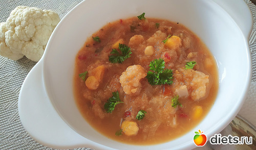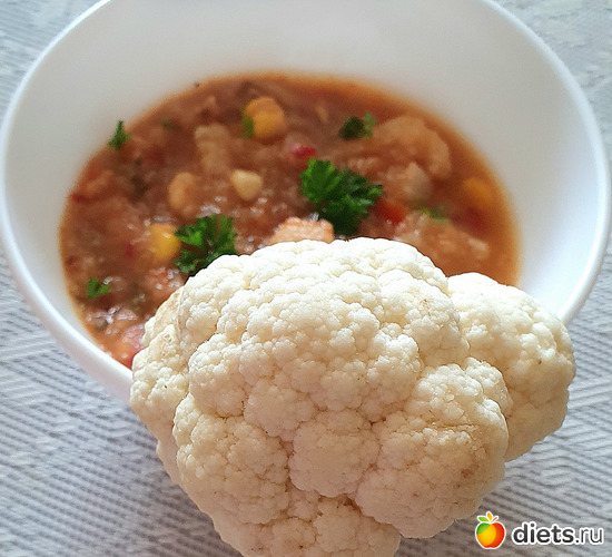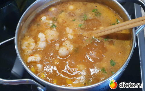 Пробила блендером. Получился суп-пюре из кочерыжки. Но я люблю чтобы в супе были кусочки, которые можно пожевать. Поэтому добавила целые соцветия капусты, отварную кукурузу, специи - еще поварила.