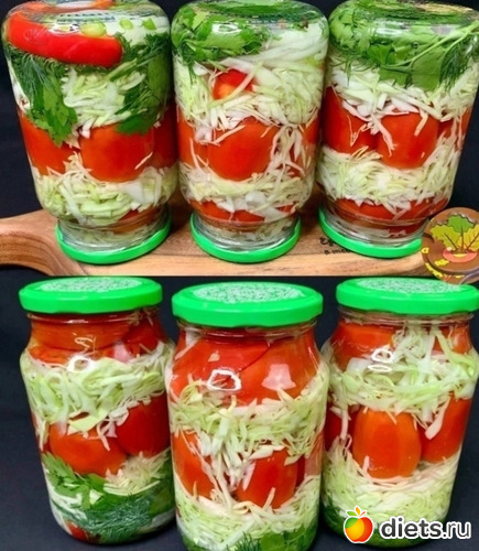 Выглядят красиво и получается очень вкусно! И капуста, и помидоры всегда съедаются быстро и с огромным удовольствием! Смело пробуйте, отличный рецепт. Зимой, действительно, пальчики оближешь!