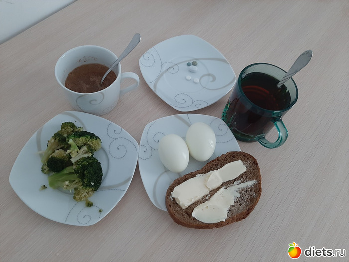 Мой завтрак: 2 вареных яйца, хлеб (27 гр) с маслом (15 гр), отварная брокколи (70 гр) и черный чай с 1 ложкой сахара.