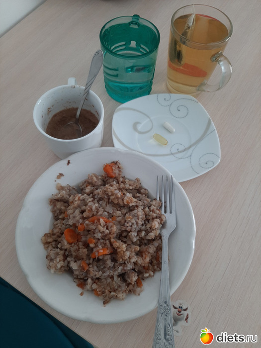 Мой обед: гречка с тушеной свининой и морковью (333 гр) и зеленый чай без сахара.
