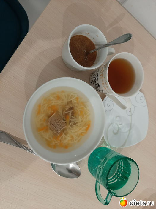 Мой ужин: суп с говядиной, вермешелью и морковью (303 гр) и зеленый чай без сахара.