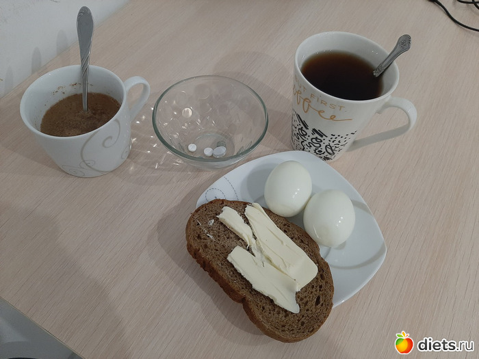 Мой завтрак: 2 вареных яйца, хлеб (24 гр) с маслом (14 гр) и черный чай с 1 ложкой сахара.