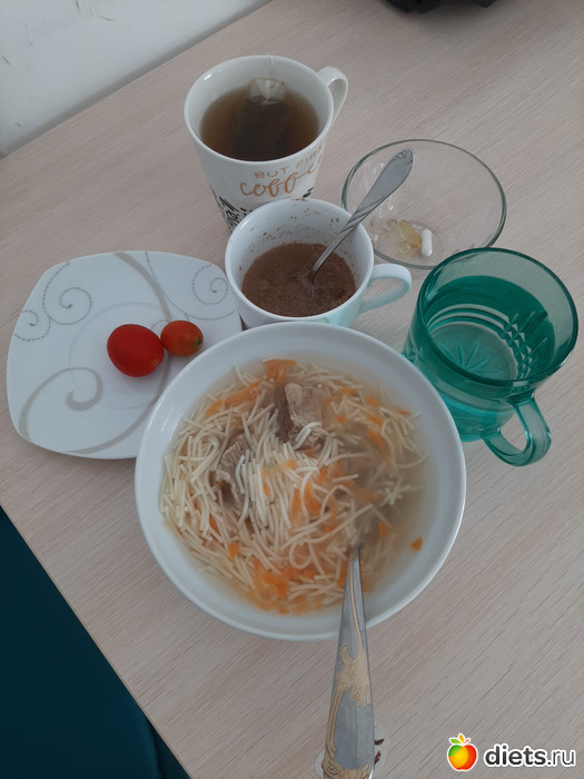 Мой обед: суп с говядиной, вермешелью и морковью (420 гр), 2 маленькие помидорки и зеленый чай без сахара.