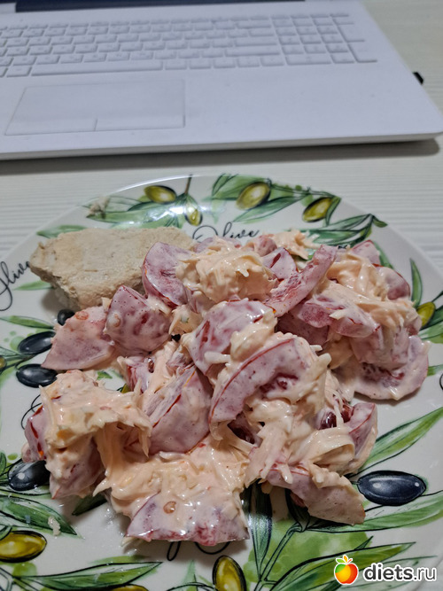 Мои размышления о том что бы поесть закончились тем, что хрюшку сварила. К последнему кусочку добавила помидоры с сыром и майонезом.