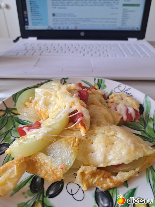Кабачки, помидоры, яйцо, сыр - сделала порцию меньше, чем обычно, а то чувствую в последнее время - не лезет.