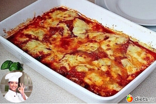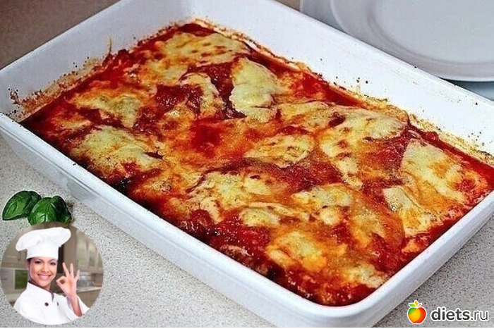14) Покрыть остальным томатным соусом, затем рубленным свежим базиликом и сверху посыпать сыром моцарелла или сыром эдам