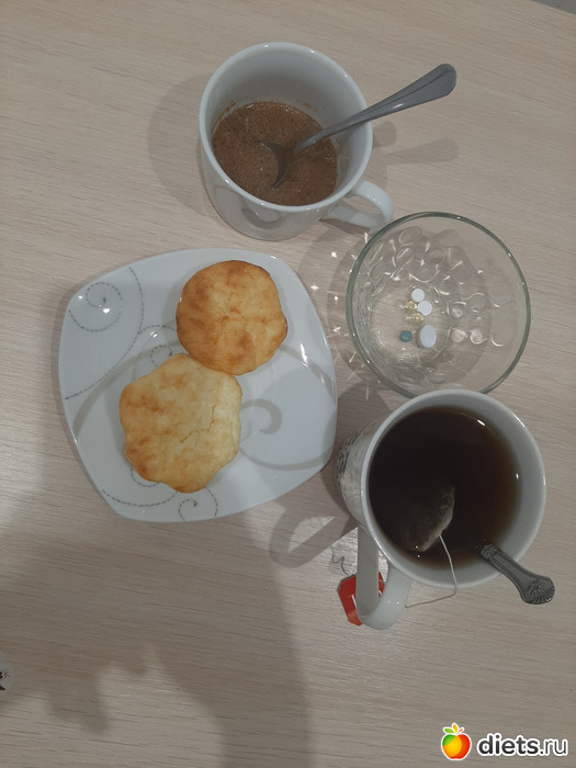 Мой завтрак: творожная запеканка (95 гр) и черный чай с 1 ложкой сахара.