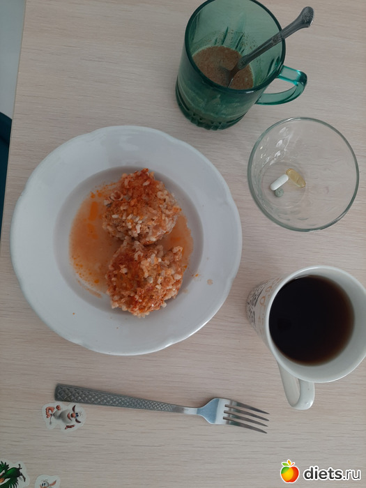 Мой обед: ёжики со свининой (264 гр) и черный чай без сахара.