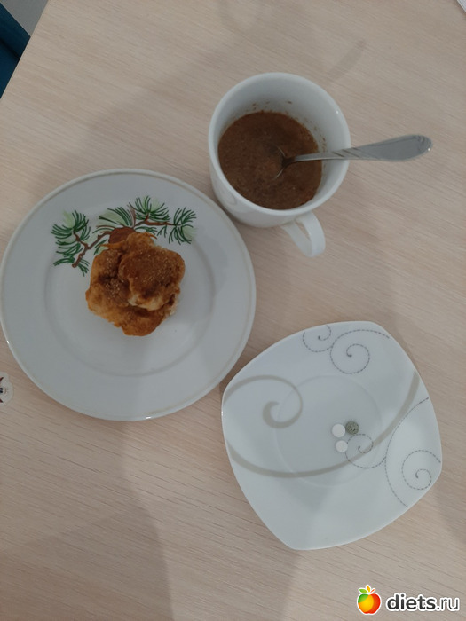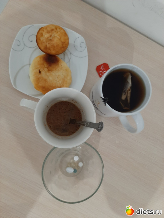 Мой полдник: черный чай с 1 ложкой сахара и кексы с яблоками и корицей (109 гр).
