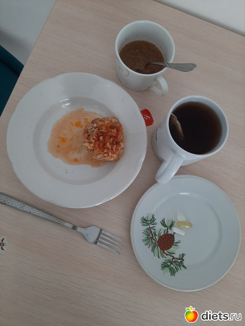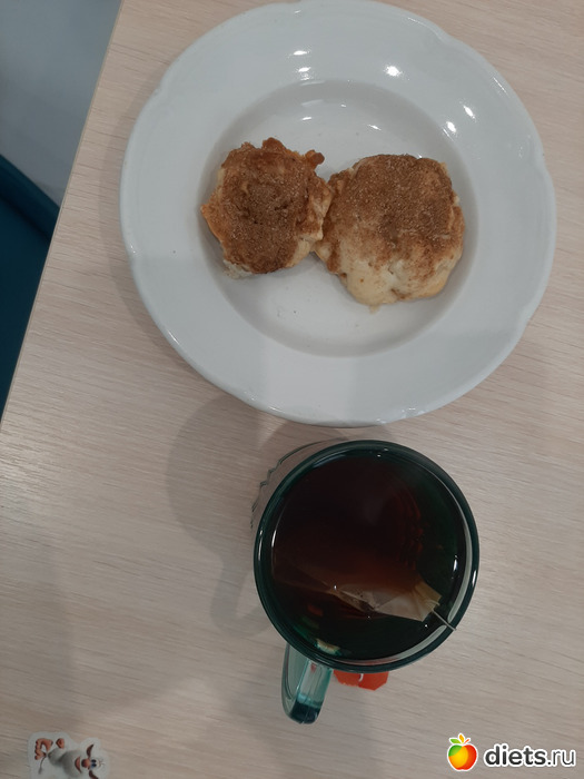 Мой завтрак: творожная запеканка (85 гр) и черный чай с 1 ложкой сахара.