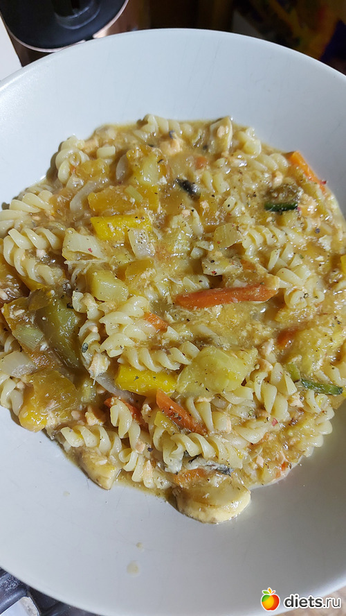 Макароны с овощами и лососем