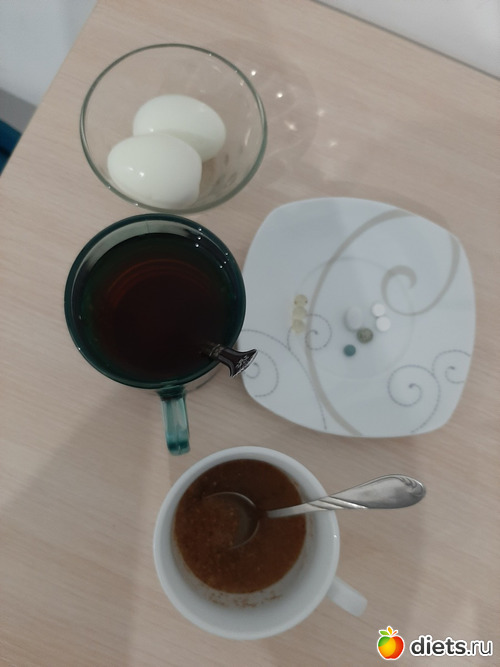 Мой завтрак: 2 вареных яйца и черный чай с 1 ложкой сахара.