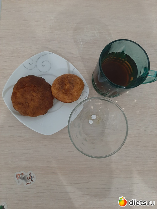 Мой завтрак: творожная запеканка (83 гр) и черный чай с 1 ложкой сахара.