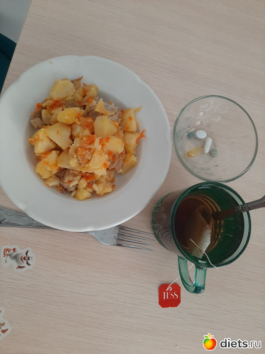 Мой обед-ужин: картофель тушеный со свининой (279 гр) и черный чай с 1 ложкой сахара.