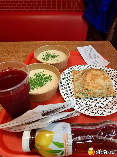 Обратно пешком пошли, по пути в Теремке пообедали. Я себе блин взяла и морс смородиновый