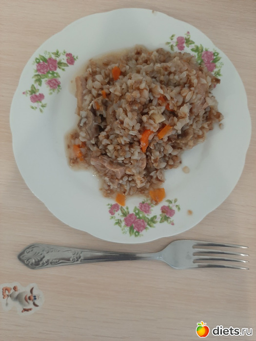 Мой обед: гречка с мясом (254 гр) и черный чай с 1 ложкой сахара.