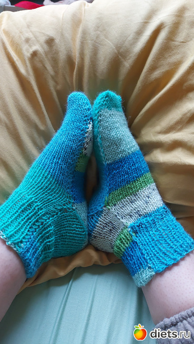 Носки я тоже вяжу по старинке на пяти спицах. Поэтому долго рассматривала твои. Интересное решение по цветовой гамме..
