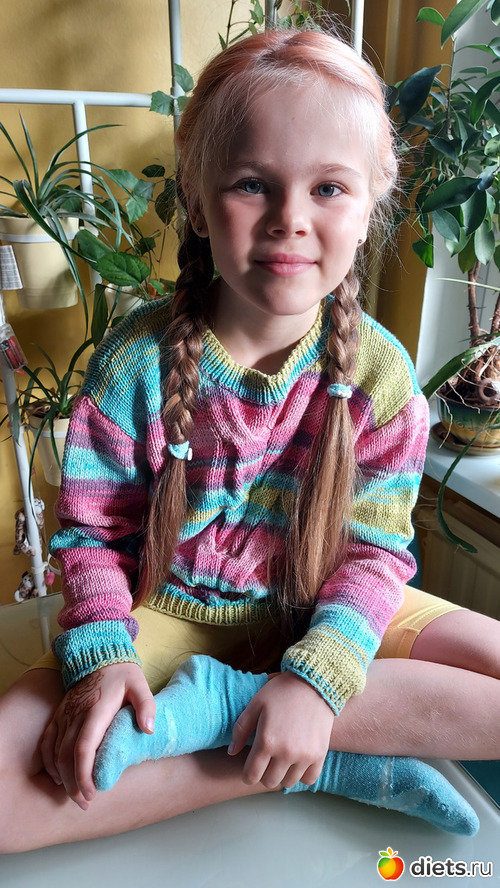 Я подвисла на белом свитере для дочи, и цветастый тоже очень понравился (нравится секционная пряжа!)
