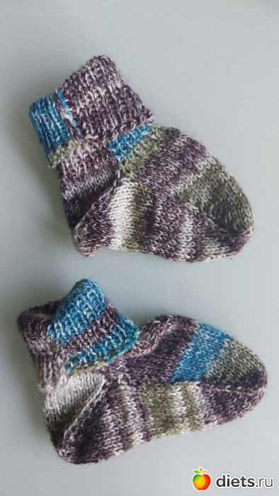 Носочки, видимо из двух деталей сшиваются. По кругу не вяжешь?
