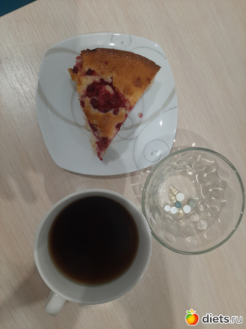 Мой завтрак: манник с красной смородиной (105 гр) и черный чай с 1 ложкой сахара.