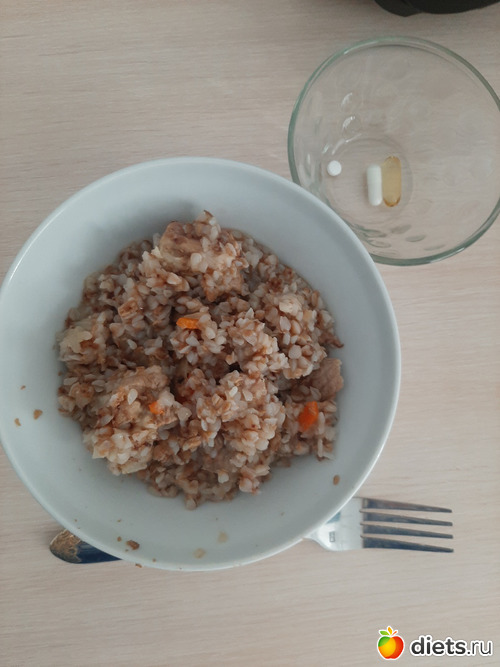 Мой обед: гречка с мясом (213 гр) и черный чай с 1 ложкой сахара.