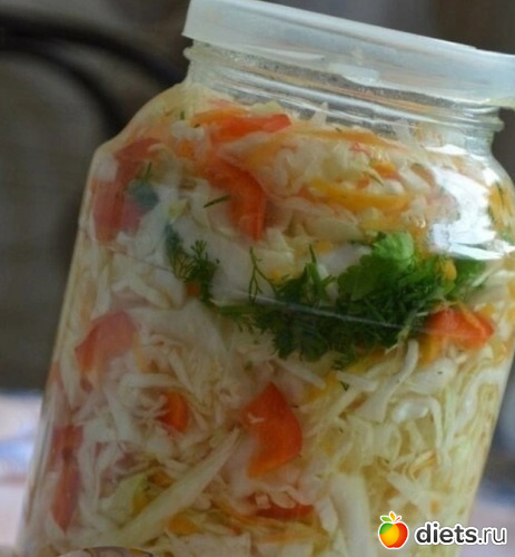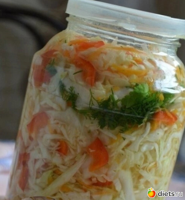 Капусту, морковь, чеснок, лук, перец и зелень режем, кладём в миску, перемешиваем аккуратно и укладываем в банку. Воду кипятим, добавляя соль, масло, сахар и уксус. Получившимся рассолом заливаем капусту в банке и закрываем крышкой (пластиковой).