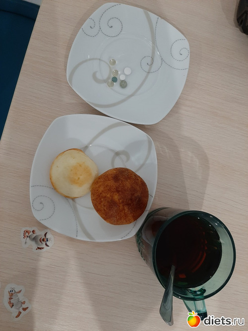 Мой завтрак: творожная запеканка (74 гр) и черный чай с 1 ложкой сахара.