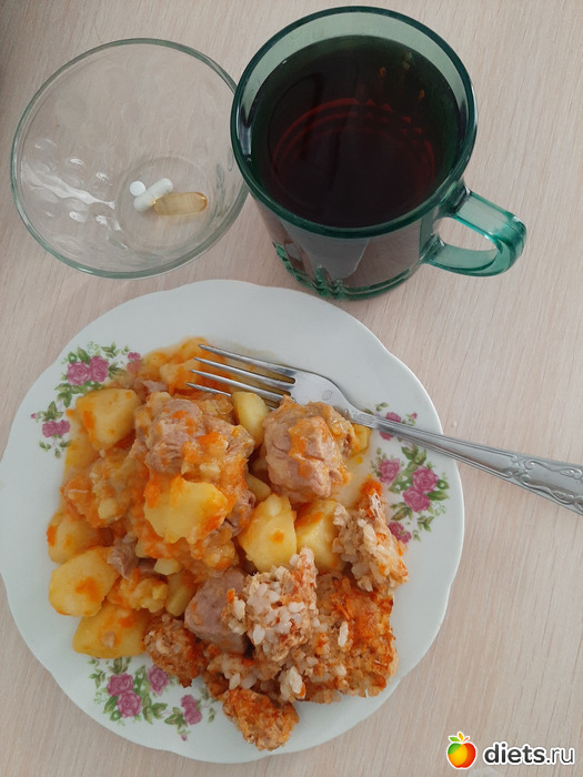 Мой обед: картофель тушеный со свининой (308 гр), ёжик с рисом из свинины (70 гр) и черный чай с 1 ложкой сахара.