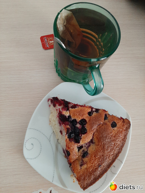 Мой полдник: творожная запеканка (82 гр), манник с черной смородиной (157 гр) и черный чай с 1 ложкой сахара.