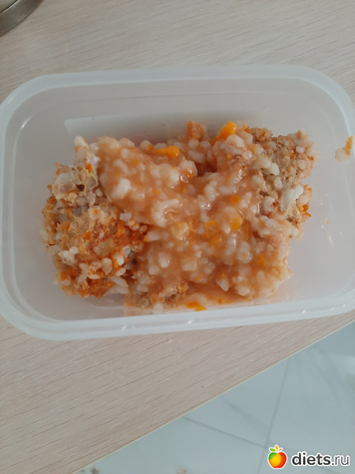 Мой обед: ёжики с рисом из свинины ( 358 гр) и вода.