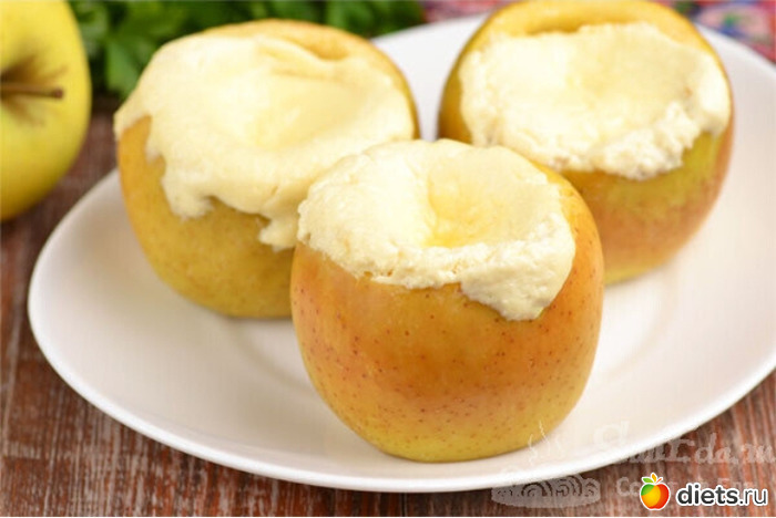 7. Творожная масса при приготовлении будет немного подниматься и чуть выходить наружу. На дне тарелки будет немного жидкости. Готовые яблоки с творогом или творожную запеканку в яблоках перекладываем на другую тарелку, немного остужаем и сразу подаем на стол. Яблоки получаются сочными, мягкими и ароматными, а сама запеканка очень-очень нежной. Блюдо в меру сладкое и очень вкусное.