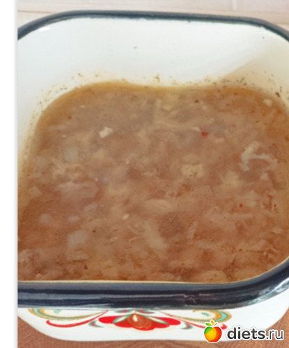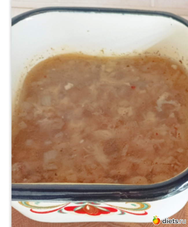 Лук мелко-мелко нарезаю. В бульон помещаю мясо, потрошки, лук, соль, перец и специи. Довожу до кипения варю до мягкости лука. Пробую на соль. Смесь должна казаться пересолёной и ярко перчёной. Перед снятием с огня добавляю измельчённый чеснок. Разливаю холодец в контейнеры.