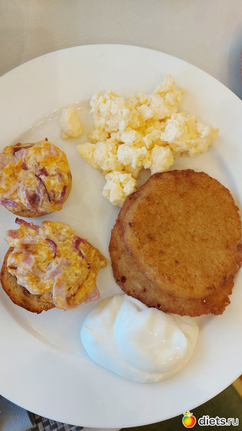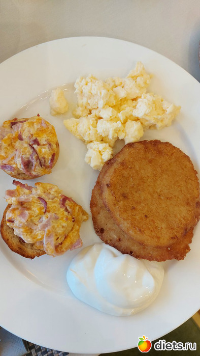 Мой завтрак, первый заход: драники со сметаной, омлет, горячие бутеры
