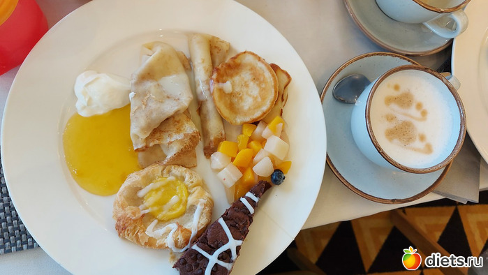 Второй заход: блинчики со сметаной и вареньем, сгущенка (даже та двух видов была), фрукты, выпечка