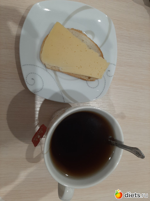 Мой завтрак: хлеб (38 гр) с сыром (40 гр), тирамису немного попробовала (примерно 40 гр) и черный чай с 1 ложкой сахара.