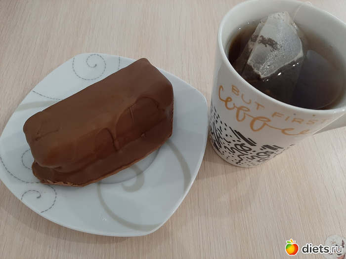 Мой полдник: пирожное шоколадное с малиновым джемом в шоколадной глазури (86 гр).