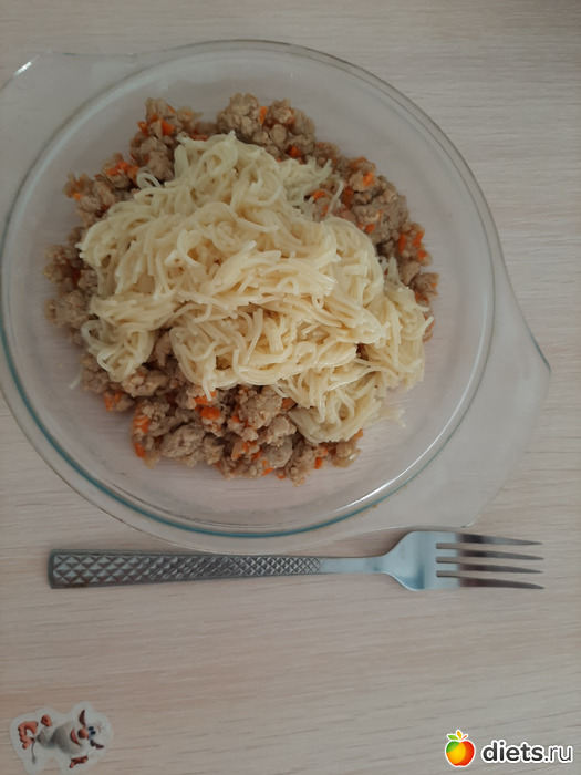 Мой обед: рыбный фарш (193 гр) с вермешелью (151 гр), квашеная капуста (99 гр) и черный чай без сахара.