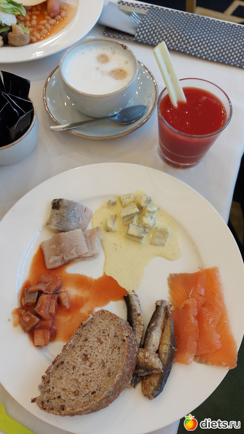 Первая тарелочка: 3 вида селедки, лосось, шпроты, хлеб, томатный сок, кофе
