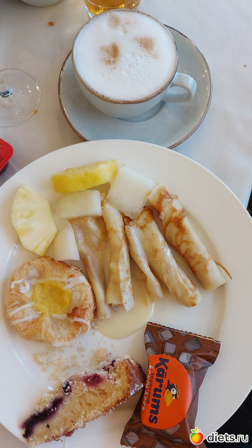 Третья тарелочка: блинчики со сгущенкой, дыня, ананас, булочка, пирог, сырок
