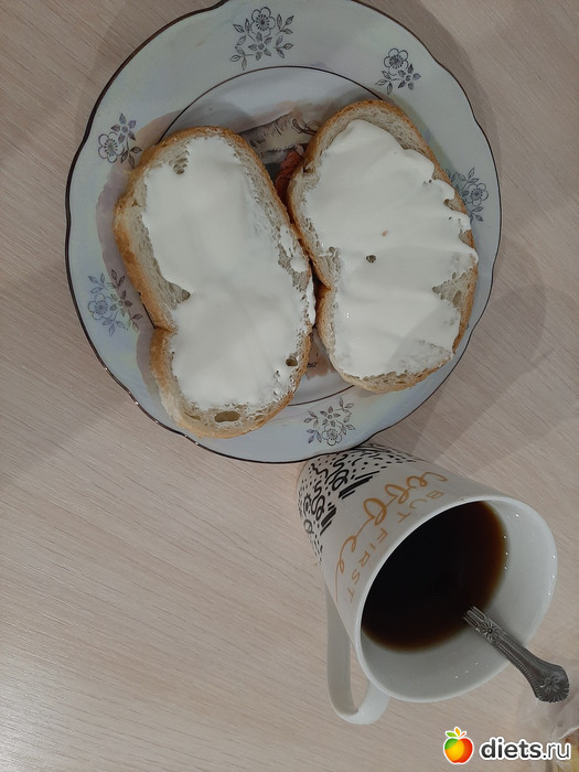 Мой завтрак: хлеб (38 гр) с плавленным сыром (39 гр) и черный чай с 1 ложкой сахара.