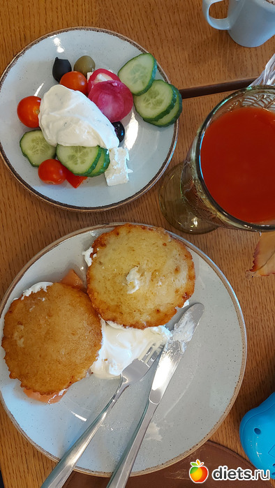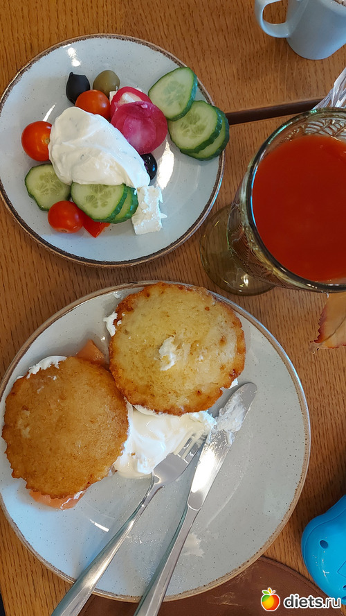 Тарелочка первая: картофельные драники с фетой и лососем, со сметаной, салат из свежих овощей, феты, оливок и соусом тадзыки, томатный сок с табаско