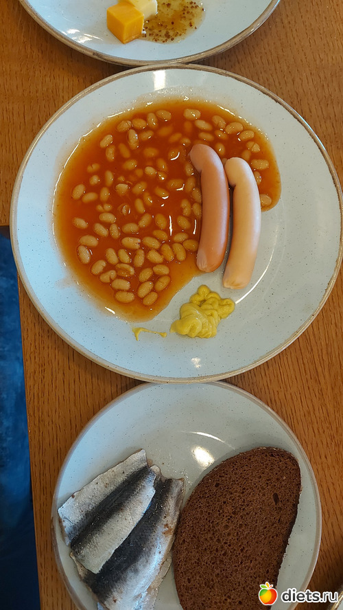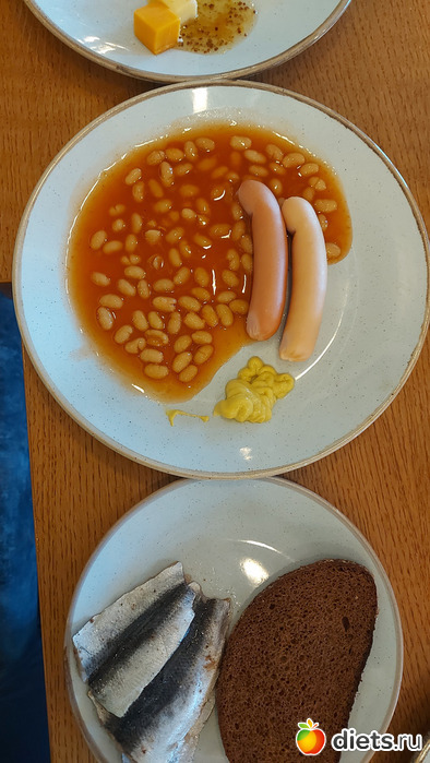Тарелочка вторая: сыры с соусом для сыров, тушеная в томатном соусе фасоль, сосиски, горчица, килька с черным хлебом