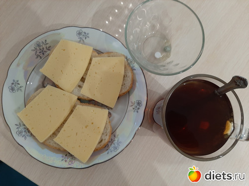 Мой завтрак: хлеб (32 гр) с сыром (66 гр) и черный чай с 1 ложкой сахара.