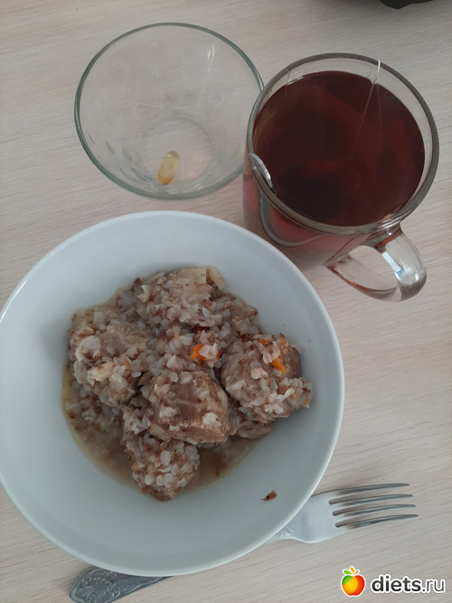 Мой обед: гречка с мясом (313 гр) и черный чай с 1 ложкой сахара.