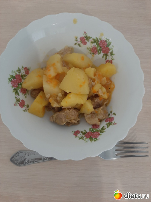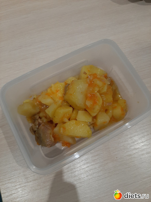 Мой обед: картофель тушеный со свининой (227 гр) и вода.