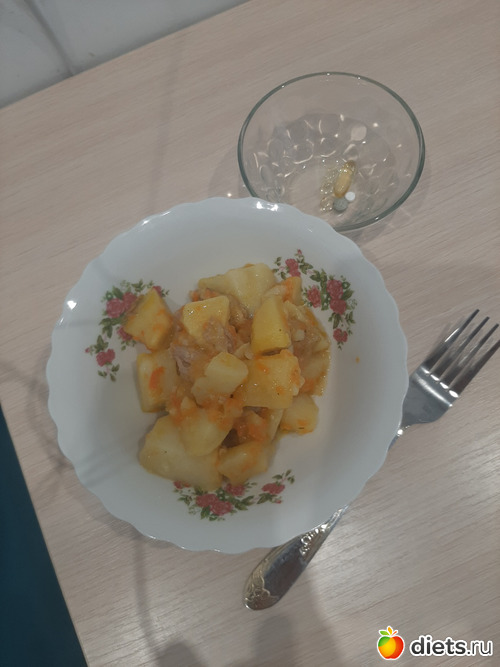 Мой обед: картофель тушеный со свининой (286 гр) и черный чай без сахара.