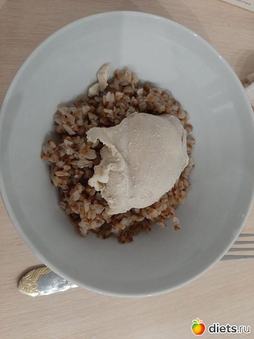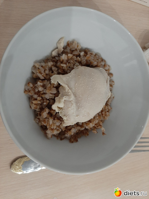 Мой ужин: гречка отварная (120 гр), куриное бедро без кожи и костей отварное (59 гр) и черный чай с 1 ложкой сахара.