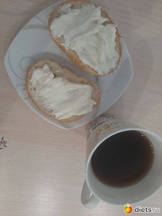 Мой завтрак: хлеб (42 гр) с плавленным сыром (29 гр) и черный чай с 1 ложкой сахара.